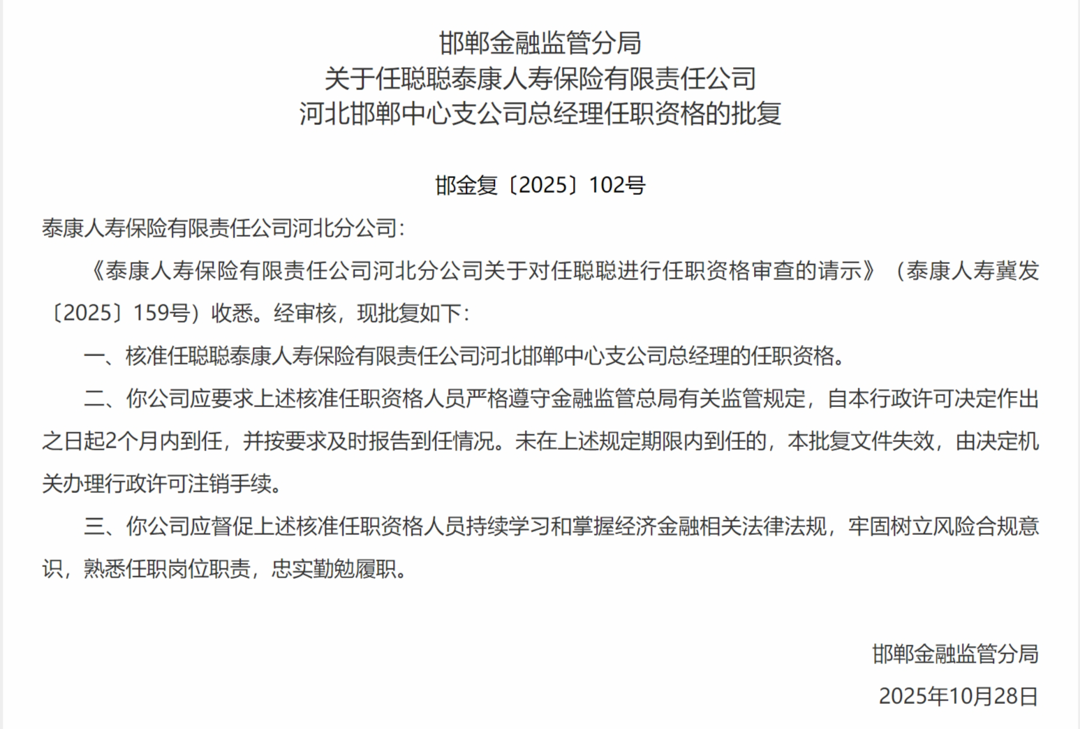 11月3日国内配资官网,邯郸金融监管分局发布关于任聪聪泰康人寿保险有限责任公司河北邯郸中心支公司总经理任职资格的批复,核准任聪聪泰康人寿保险有限责任公司河北邯郸中心支公司总经理的任职资格。
