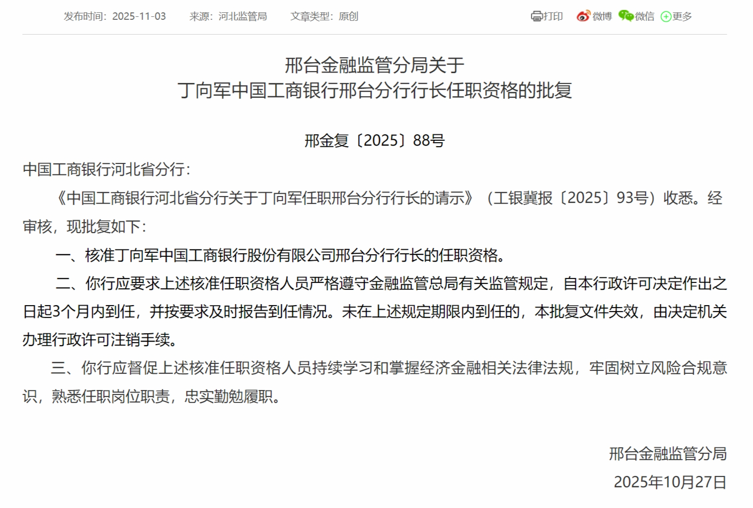 11月3日配资可信股票配资门户,邢台金融监管分局发布关于丁向军中国工商银行邢台分行行长任职资格的批复,核准丁向军中国工商银行股份有限公司邢台分行行长的任职资格。